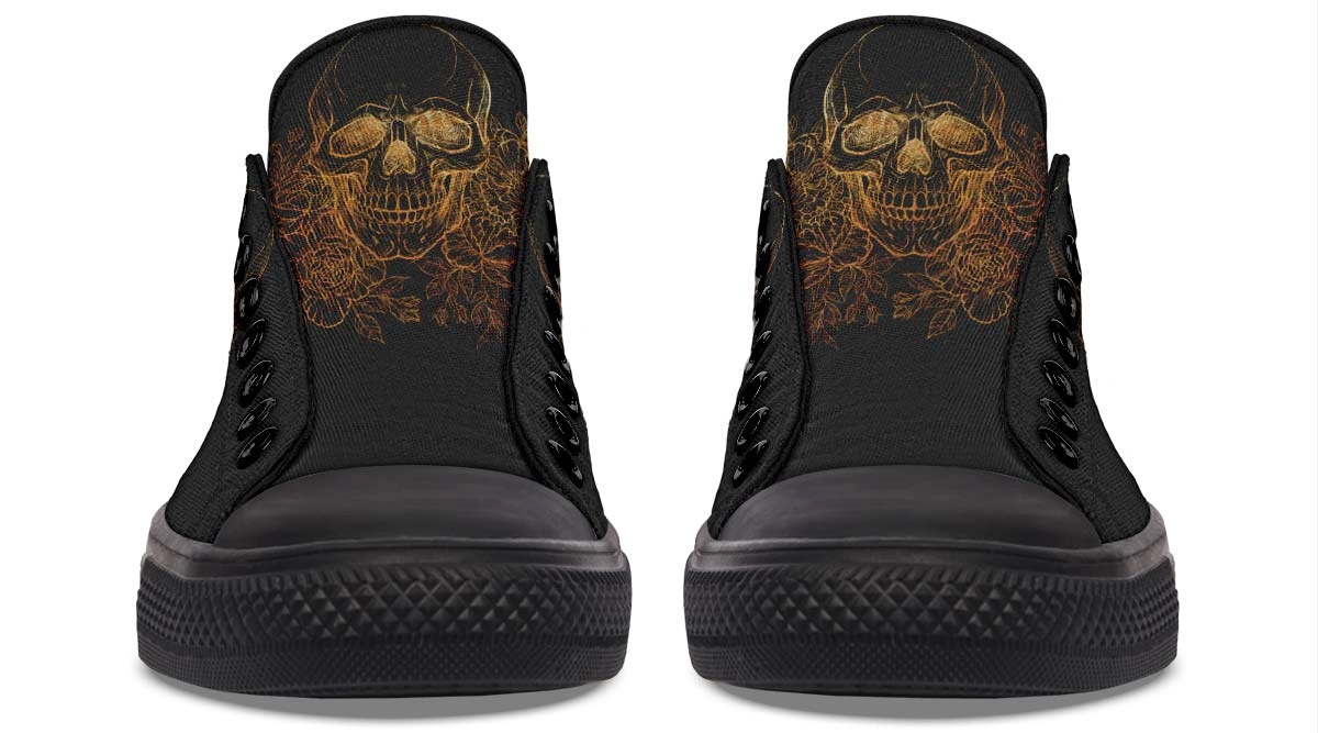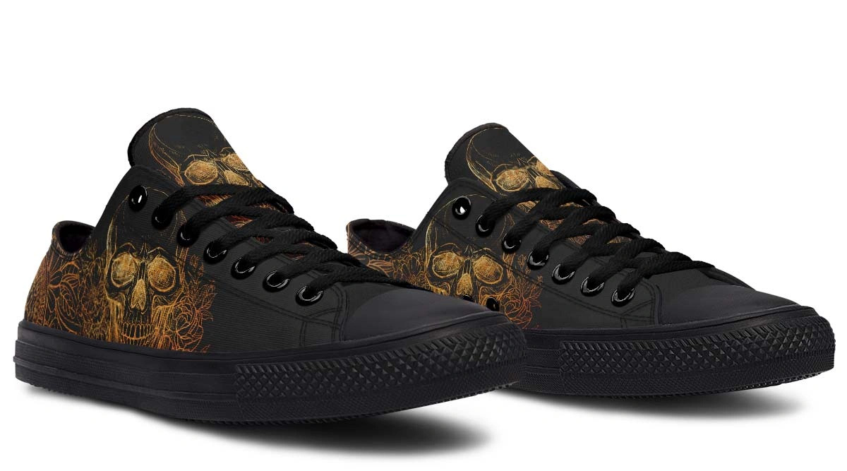 Upgrade your sneaker rotation with our Gold Foil Skull Pattern Black Lowtop Sneakers. Designed for those who demand attention, these shoes feature a brilliant metallic gold skull motif printed on a sleek black background. Combining luxury aesthetics with casual comfort, these sneakers are perfect for nightlife, streetwear ensembles, or making a confident daily statement. With a focus on durability and a modern low-profile fit, these gold-detailed sneakers ensure you stand out from the crowd with every step while maintaining premium comfort.