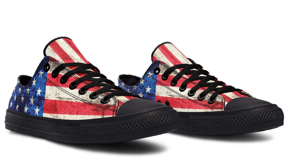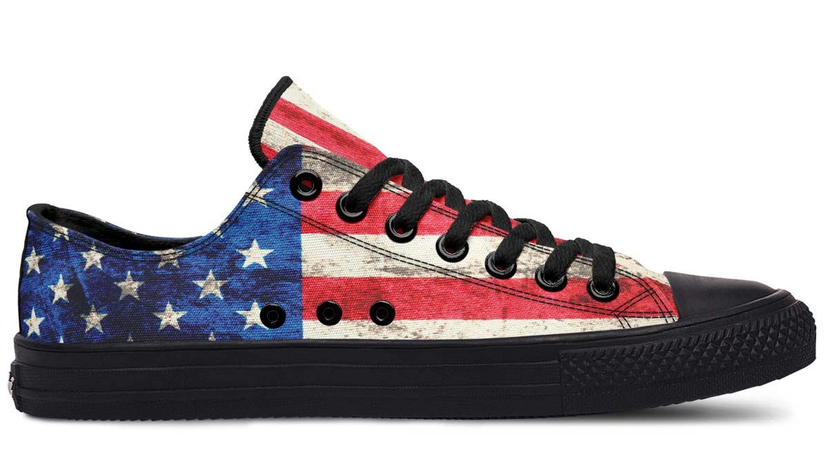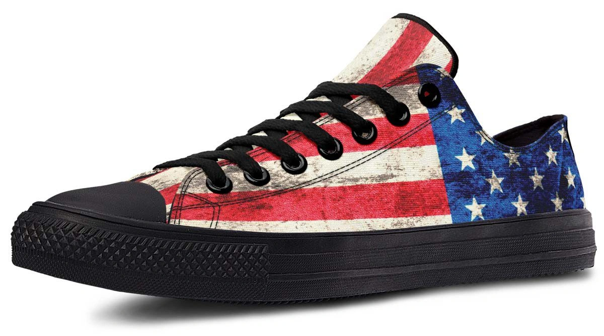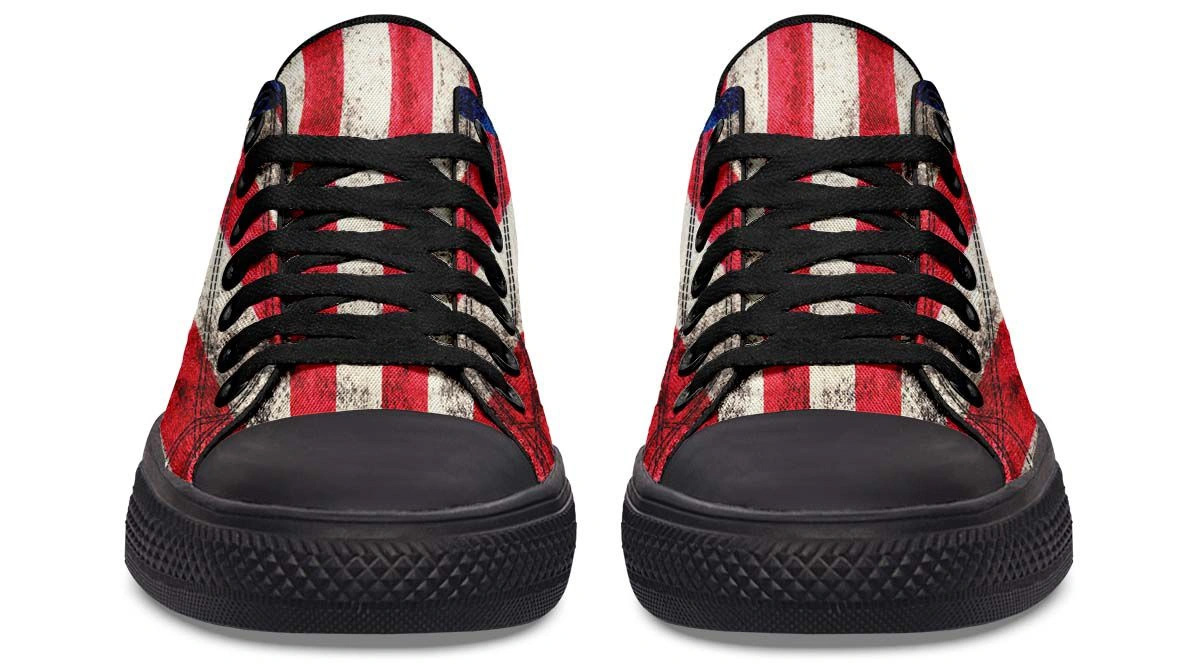Show your pride with Retro American Flag Black Low-Top Sneakers. Stylish, patriotic footwear featuring a vintage USA flag design for casual everyday wear.