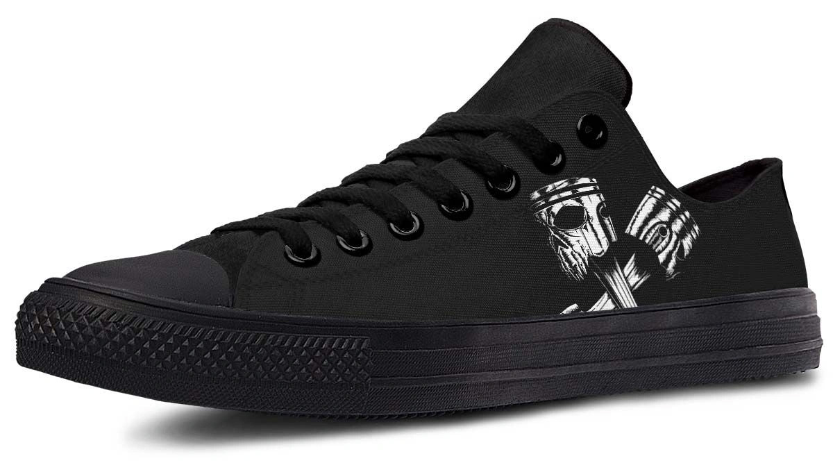Rev up your style with Skull Engine Motor Black Low-Top Sneakers. Edgy, comfortable, and durable footwear perfect for everyday wear and biker aesthetics.